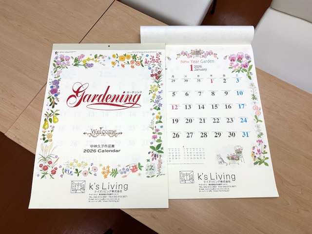 一方、事務所には2026年カレンダーが届きました。例年通り中神久子さん作の『ガーデニング』ですが、12月に入りましたらお世話になった皆様へお届け致しますので楽しみにしておいて下さい。