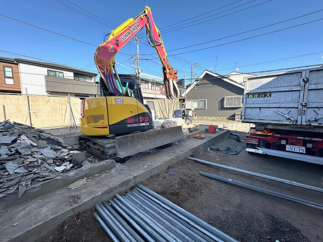 今年は1月から新現場を発売するための解体工事や造成工事が重なり、複数箇所で工事ラッシュとなっています。地元福生は南田園にて2区画の分譲現場を販売するため長年使用した建物の解体工事を済ませ、先週末より外構ブロック及びフェンス工事に臨んでいます。