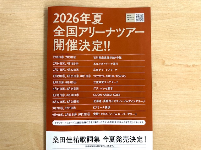 先月26日の桑田さんの誕生日にファンクラブから嬉しいメールが届き『NEW70’S ここからが始まりでしょ』を合い言葉に2026年夏、全国アリーナツアー開催の知らせでした。7月8日の石川県を皮切りに全国10ヶ所22公演が予定され、8月のTOYOTA ARENA TOKYO 3公演と9月のKアリーナ横浜 2公演に行きたいと思います。