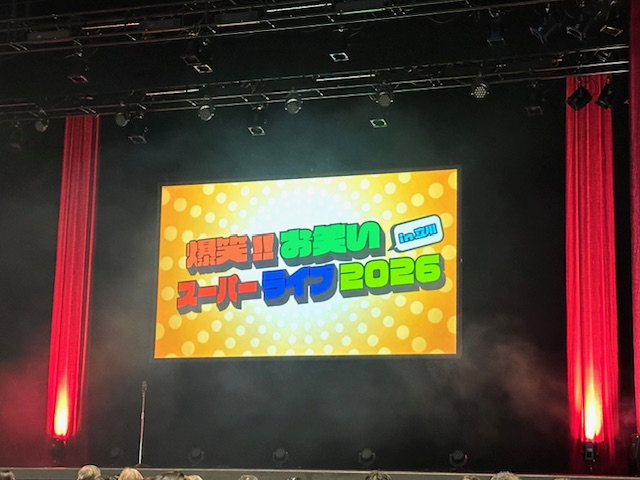 今日は『爆笑!お笑いスーパーライブ2026』を見るために立川ステージガーデンに来ました。15時30分開演で14組の芸人が出演する2時間のライブです。トップバッターはあばれる君のコントでTVより身体が大きくがっしりした感じでした。カミナリ、や団、吉住、スパイシーガーリック、トムブラウン、あーしらき、錦鯉、春とヒコーキ、マシンガンズ、真空ジェシカ、ザコシ、U字工事、どぶろっくが持ちネタを披露し文字通り爆笑。6月に福生市民会館に出演した芸人さんは同じネタだったのでちょっと残念。