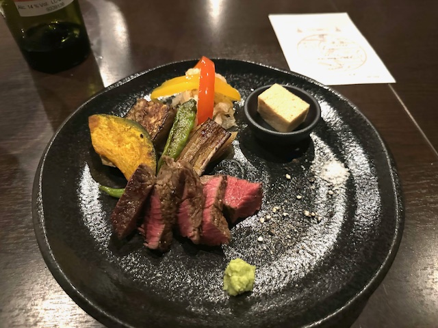 蟹みそソースのサラダでお料理開始。まぐろネギトロ手巻き、伊勢エビ鉄板焼き、大ぶり牡蠣ソテー、メインは黒樺牛フィレステーキをいただきました。人間ドックを控えアルコールをセーブしてたのですが、うれしさのあまり主役でもないのに『toso』という赤ワインを2本も開けてしまいました。(3人で)