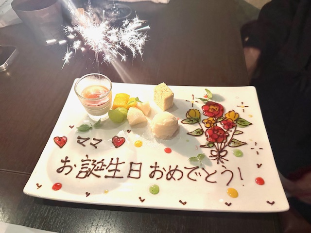 食事の最後には誕生日デザートを頂き、満足なdinnerを楽しみました。ごちそうさま。