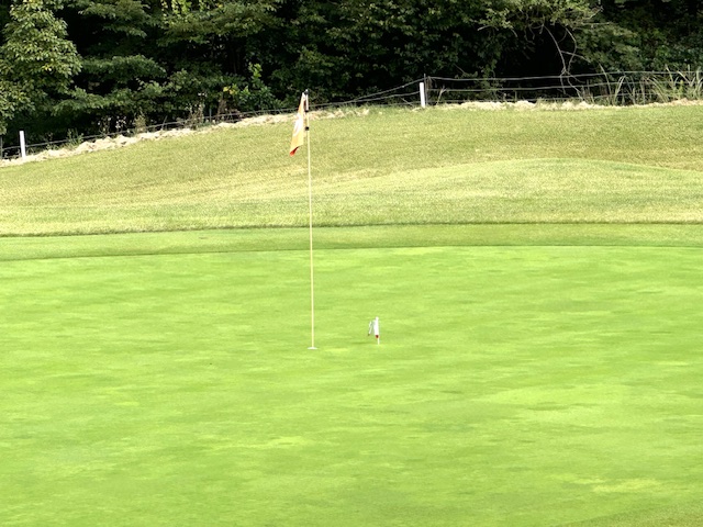 前半6番140ヤードのショートホールでは、前の組でニアピン権利を取り大喜びのN村君の内側に付けバーディーを奪取。普段M本さんから残念がられるアプローチは、日々の練習の成果を発揮することが出来OKパーを連発し、今回はもしかして初優勝が狙える・・・。